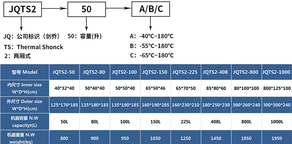 • 兩廂式冷熱沖擊試驗箱型號命名及參數表