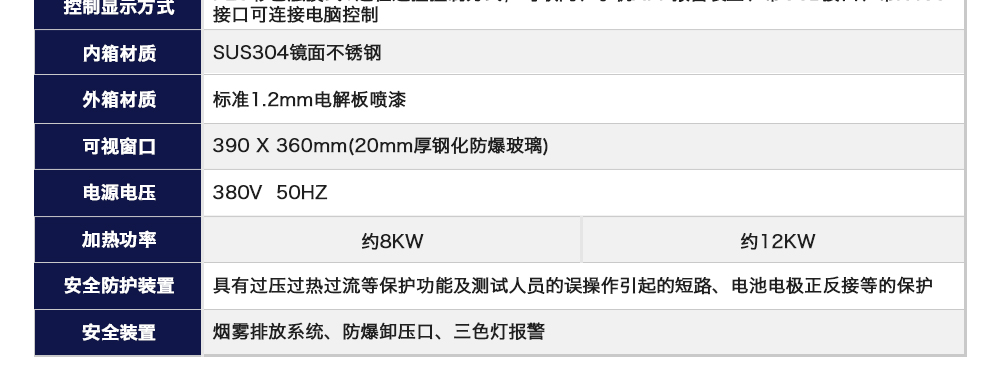 用途:熱濫用試驗箱是一款根據UL1642、IEC62133等測試標準要求而定,電池充滿電后,將電池放入試驗箱中。試驗箱以(5±2)℃/min的溫升速率進行升溫,當箱內溫度達到130℃±2℃后恒溫,并持續
