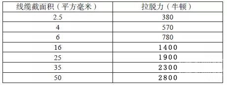 2.1.1 端子至線纜的拔出力:該測(cè)試是為了確保線束在車輛裝配過程及后續(xù)使用產(chǎn)生的作用力不會(huì)使線纜脫出端子,從而造成產(chǎn)品失效。該測(cè)試與供應(yīng)商的壓接參數(shù)和線纜接插件匹配度有高度相關(guān)性。具體力學(xué)性能要求見表1。